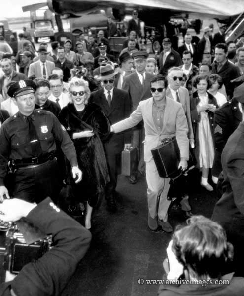 Marilyn Monroe and Milton H. Greene arrive at Idlewood Airport, New York the day after her 30th birthday, 1956
